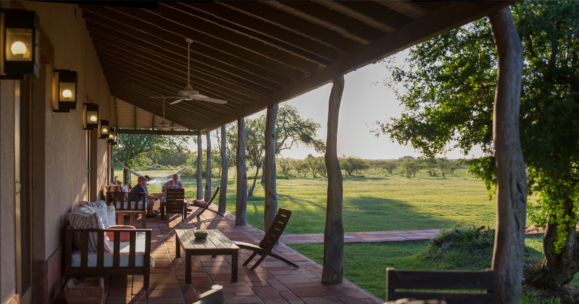 A separate building, connected by covered walkways and open-air patios, houses the spacious living room, bar, and dining area — each opening onto wide verandas with sweeping views of the landscape. Designed by award-winning architects, the lodge blends traditional local elegance with all the comforts and luxuries of a contemporary hotel. After an exhilarating day in the field, relax with a cocktail by the fire, share stories with fellow hunters, or unwind under the open sky.